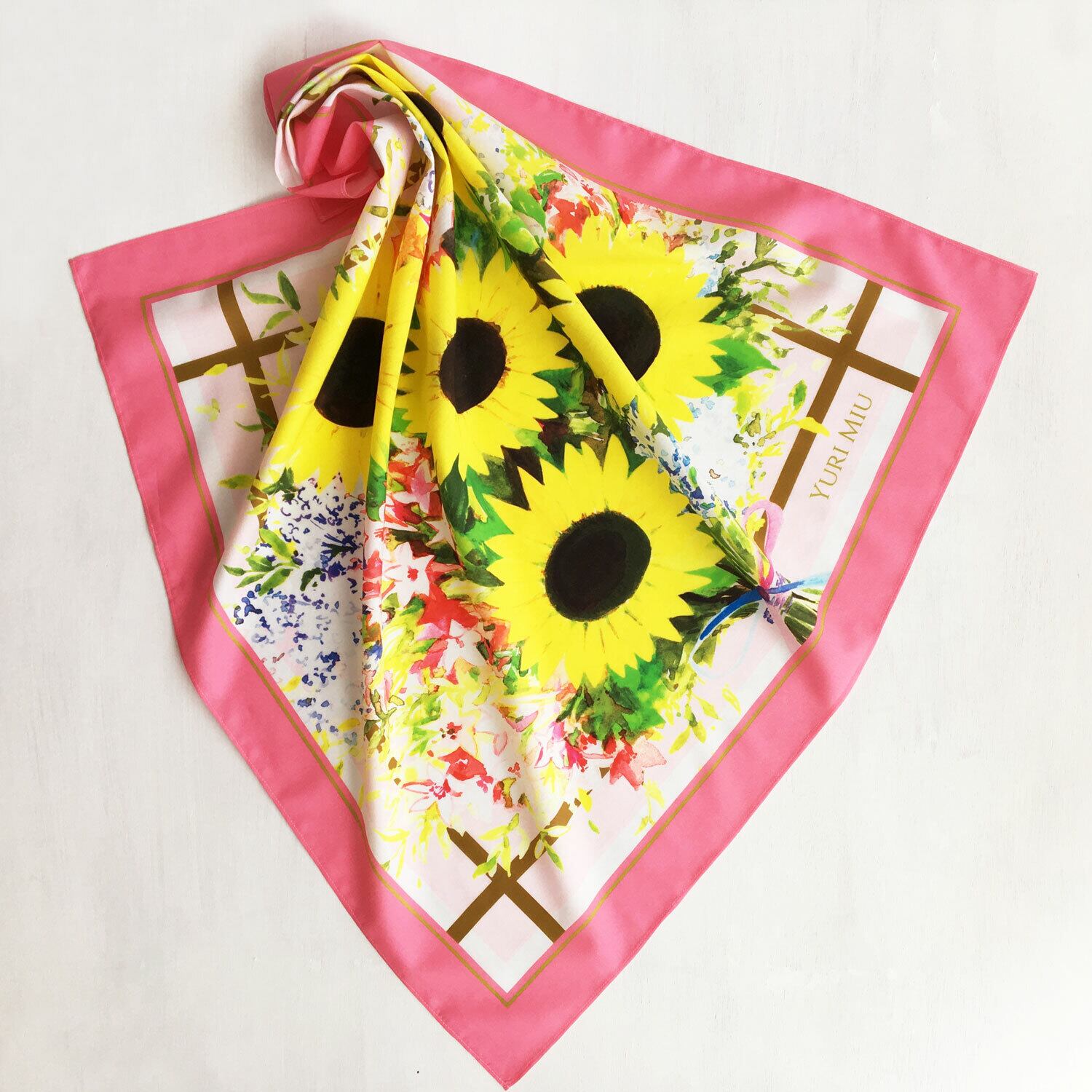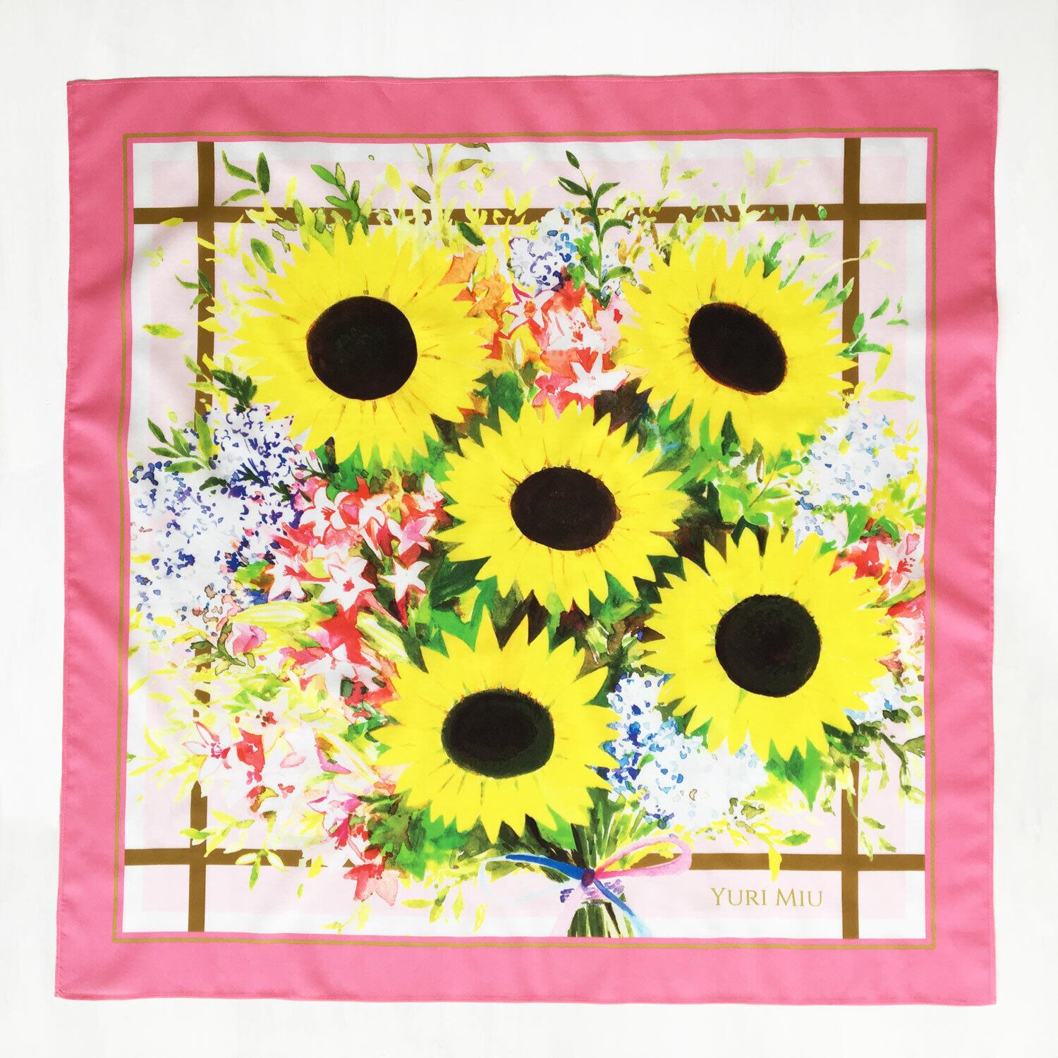 サンプルSALE * ミニスカーフ|向日葵のブーケ(ピンク)[正方形フォルム(スクエア) / コットン100%]